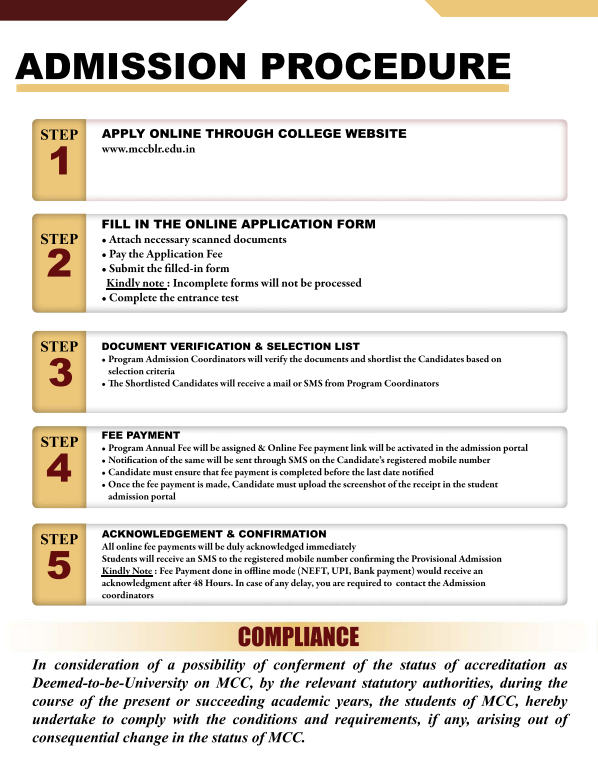 The admission dates and timeline for the admission process are announced in the college website (www.mccblr.edu.in) before the commencement of the admission for the academic year concerned. Applicants can access and submit application forms online through the web portal. A non-refundable application fee must be paid by the applicant for each application.